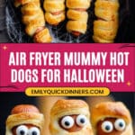 These Air Fryer Mummy Hot Dogs are a fun and festive Halloween snack made with hot dogs wrapped in crescent dough strips to resemble mummies. Topped with adorable candy eyes and cooked to golden perfection in the air fryer, they’re a quick, easy, and crowd-pleasing treat perfect for parties or spooky celebrations.