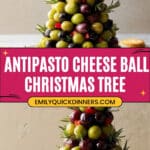This festive Antipasto Christmas Tree Cheese Ball is a creamy and savory holiday appetizer featuring a blend of provolone, parmesan, cream cheese, and flavorful antipasto ingredients like pepperoncini, salami, artichokes, and marinated olives. Molded into a beautiful Christmas tree shape and decorated with olives, roasted red peppers, and fresh rosemary, it’s perfect for holiday parties and gatherings. Serve with crackers or crostini for an impressive and delicious appetizer everyone will love.