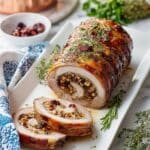 - Stuffing, Rolling & Tying: Spread the filling evenly over the pork loin, leaving a 1 1/2 to 2 inch seam at one edge. Roll starting at a short end with fat side out. Tie the roll with kitchen twine in loops, ensuring it’s snug but not too tight. Tie a knot at the end and trim excess string.