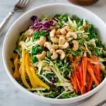 This Asian Crunch Salad is a vibrant and refreshing dish combining a mix of kale slaw, green cabbage, cucumbers, carrots, and bell peppers, all tossed in a tangy and slightly sweet Asian-inspired dressing with a delightful cashew crunch. Perfect as a light lunch or a colorful side, this salad balances crisp textures and bold flavors with a hint of spice from red pepper flakes.