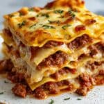 This Parmesan Garlic Bacon Cheeseburger Lasagna is a hearty and flavorful twist on classic lasagna, combining the savory taste of cheeseburgers with rich béchamel and crispy bacon. Layers of meat sauce, creamy Parmesan garlic béchamel, and a blend of mozzarella, cheddar, and Parmesan cheeses are baked to bubbly perfection, making it a perfect comfort food meal for family and friends.