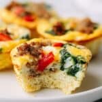 These baked egg cups are a versatile and protein-packed breakfast option made with eggs, ground pork sausage, fresh spinach, and red bell pepper. Baked in a muffin tin, they are easy to prepare, perfect for meal prep, and can be enjoyed warm or chilled for a convenient, nutritious start to your day.