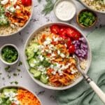 - Assemble Bowls: In serving bowls, place a layer of cooked rice, a generous portion of shredded buffalo chicken, then top with diced cucumbers, matchstick carrots, diced red onion, and optionally, blue cheese crumbles. Drizzle with ranch dressing and garnish with chopped green onions. Serve immediately and enjoy!