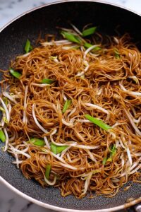 This Cantonese Chow Mein recipe features thin, fresh Hong Kong-style egg noodles stir-fried to a perfect crispiness and tossed with savory soy-based sauce, crunchy bean sprouts, and aromatic onions. Quick and flavorful, it’s a classic stir-fried noodle dish that combines textures and rich umami notes in every bite.