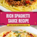 While the sauce simmers, cook your spaghetti according to package instructions until al dente. I like to reserve a little pasta water before draining—it can help loosen the sauce if it gets too thick when you toss them together. When ready, mix the spaghetti right into the sauce or serve the sauce ladled generously over the pasta.