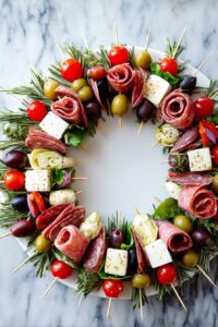 Take your large toothpicks and start skewering your ingredients in combinations that excite you — like a slice of salami folded neatly, then a mozzarella pearl, followed by an olive or a bit of roasted red pepper. You’ll want to mix up colors and textures for visual appeal. Then, arrange the skewers on your round platter in a wreath shape, leaving the center hollow like a festive ring.