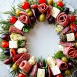 - For the wreath I used salami, mozzarella, fontina, dill havarti, green olives, black olives, marinated artichokes, roasted red peppers, mini pickles, cherry tomatoes, rosemary sprigs, and microgreens.