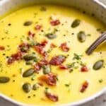 - Serve: Ladle the soup into bowls and garnish with crispy bacon, pumpkin seeds, and grated Parmesan if desired. Enjoy warm.