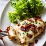 This Cheesy Bacon Ranch recipe features juicy, seasoned chicken breasts cooked to perfection in a skillet with crispy bacon and melted mozzarella cheese, delivering a savory and comforting dish ideal for a quick and delicious dinner.