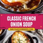 Classic French Onion Soup is a hearty and comforting dish featuring sweet, caramelized onions simmered in a rich beef broth base, topped with toasted baguette slices and melted Gruyere cheese. This savory soup combines deep, layered flavors, perfect for a cozy meal.
