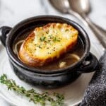 - Finish the Soup – Option 2 (Traditional): Ladle soup into oven-safe bowls or crocks placed on a baking sheet. Top each with a toasted baguette slice and about ⅓ cup shredded Gruyere cheese. Broil until cheese is melted and bubbly, approximately 2 minutes. Watch closely to avoid burning. Serve immediately.