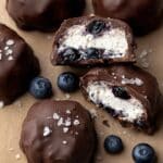 Delicious and healthy Chocolate Dipped Blueberry Cottage Cheese Clusters combine fresh blueberries, crunchy pecans, and creamy low-fat cottage cheese, sweetened with maple syrup and vanilla, then dipped in rich dark chocolate with a hint of coconut oil and sea salt. Perfect for a nutritious snack or dessert with a satisfying blend of textures and flavors.