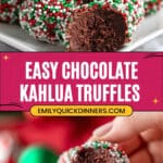 Indulge in these decadent Chocolate Kahlua Truffles, perfect for holiday gatherings or a special treat. Rich semi-sweet chocolate melds beautifully with the smooth sweetness of condensed milk and the distinctive coffee-flavored liqueur, Kahlua. Coated in festive red, green, and white sprinkles, these truffles are as visually delightful as they are delicious.