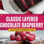 This Layered Chocolate Raspberry Cake is a decadent dessert featuring moist chocolate cake layers filled with rich chocolate frosting and tangy raspberry filling, all topped with a luscious chocolate ganache and fresh raspberries. Perfect for special occasions, this cake combines the deep flavor of cocoa with the fresh brightness of raspberries for a delightful treat.