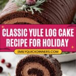 This classic French Bûche de Noël, or Yule Log Cake, is a beautifully rolled chocolate sponge cake filled with a rich, silky bittersweet chocolate and cream cheese filling, covered in decadent chocolate ganache, and decorated with optional sugared cranberries, rosemary, and pistachio soil for a festive presentation. Perfect for holiday celebrations, this cake combines delicate textures and bold flavors with a stunning visual appeal.
