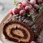 This classic French Bûche de Noël, or Yule Log Cake, is a beautifully rolled chocolate sponge cake filled with a rich, silky bittersweet chocolate and cream cheese filling, covered in decadent chocolate ganache, and decorated with optional sugared cranberries, rosemary, and pistachio soil for a festive presentation. Perfect for holiday celebrations, this cake combines delicate textures and bold flavors with a stunning visual appeal.