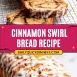 Delight in this homemade Cinnamon Swirl Bread, featuring a moist and tender crumb swirled with a sweet cinnamon sugar filling. Perfectly baked to a golden finish and topped with a light confectioners’ sugar glaze, this bread is an irresistible treat for breakfast or snack time.