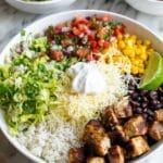 This Chipotle Burrito Bowl copycat recipe brings the bold, smoky flavors of Chipotle’s famous bowl right to your kitchen. Featuring chipotle-marinated chicken served over bright cilantro lime rice, topped with fresh corn salsa, black beans, shredded lettuce, Monterey Jack cheese, creamy guacamole, sour cream, and vibrant homemade tomato salsa. Perfect for a satisfying, colorful, and customizable meal, it’s easy to prepare with make-ahead options for each component.
