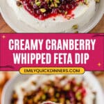 This Cranberry Whipped Feta Dip is a delicious holiday appetizer featuring creamy whipped feta and cream cheese combined with tart cranberry sauce, sweet honey, and crunchy pistachios. Perfect for serving with toasted bread or crackers, it offers a perfect balance of savory, sweet, and tangy flavors with a smooth and fluffy texture.