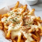 - Assemble and serve: Pour the hot cheese sauce evenly over the cooked fries. Optionally, sprinkle the remaining cayenne powder on top for extra heat. Serve immediately while warm.
