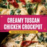 This Crockpot Tuscan Chicken recipe features tender chicken breasts simmered in a creamy, flavorful sauce with sun-dried tomatoes, garlic, Parmesan cheese, and fresh spinach. Cooked low and slow in a crockpot, it’s an easy and comforting dish perfect for dinner served over pasta.