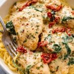 This Crockpot Tuscan Chicken recipe features tender chicken breasts simmered in a creamy, flavorful sauce with sun-dried tomatoes, garlic, Parmesan cheese, and fresh spinach. Cooked low and slow in a crockpot, it’s an easy and comforting dish perfect for dinner served over pasta.