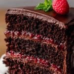 A decadent and richly chocolatey chocolate raspberry cake featuring layers of moist cocoa cake, fresh raspberry filling, smooth chocolate buttercream, and a luscious chocolate raspberry ganache. Perfect for celebrations or any occasion requiring an elegant dessert with a perfect balance of sweet and tart flavors.
