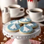 - Pipe decorations: Transfer buttercream to a pastry bag fitted with a small round tip (#3). Starting at the upper edge of a cookie, pipe Christmas tree shapes using increasingly wider horizontal lines, stopping about ¼-inch from the bottom edge. Immediately sprinkle white nonpareils on the piped trees. Optionally, add pearlized snowflake toppers. Let dry completely before storing.