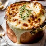 This classic French Onion Soup recipe features deeply caramelized onions, a rich beef broth, toasted baguette slices, and melted Gruyere cheese, creating a comforting and flavorful dish perfect for any occasion.