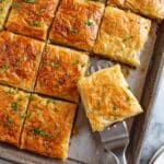 - Complete Phyllo Layers: Continue layering the remaining phyllo dough over the meat filling in the same manner—2-3 sheets at a time—brushing each layer with the oil mixture until all the phyllo dough has been used. Once assembled, cut the layered pie into squares or diamond shapes according to your preference.