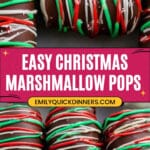Festive and fun Christmas Marshmallow Pops featuring triple-stacked marshmallows dipped in rich Ghirardelli chocolate and decorated with colorful candy melt drizzles in red, white, and green. Perfect for holiday parties and easy to make with minimal ingredients and microwave melting method.