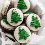 - Draw Christmas trees: Using a back-and-forth motion, pipe green Christmas tree shapes on the white chocolate half of each Oreo cookie.