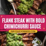 This Argentinian-inspired Flank Steak with Chimichurri Sauce is a flavorful and easy-to-make dish featuring tender, marinated flank steak quickly seared to juicy perfection and topped with a fresh, vibrant chimichurri sauce bursting with herbs and a mild kick of heat.