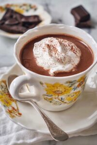 It should be thicker than classic American hot cocoa but not as thick as chocolate fondue. Think velvety and rich enough to coat the back of a spoon — that luscious thickness is what makes French hot chocolate so indulgent.