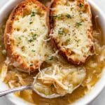 This French Onion Chicken Soup combines the rich, caramelized flavors of slowly cooked yellow onions with tender shredded chicken in a savory broth, enhanced by white wine, sherry, and fresh vegetables. Served with optional Gruyère cheesy toasts broiled until bubbly, this hearty and comforting soup is perfect for a warming meal.