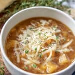 - Finish and Serve: Remove the bay leaves and thyme sprigs from the soup. Ladle the soup into bowls, topping each serving with a generous amount of shredded Swiss or Gruyere cheese. Garnish with fresh thyme and freshly ground black pepper if desired. Serve hot and enjoy!
