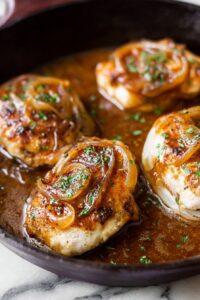 - Use chicken thighs instead of pork chops: I’ve swapped in bone-in chicken thighs for a juicier twist, and it works beautifully with the onion and cheese sauce.