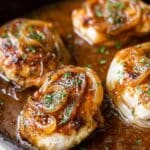 One Pan French Onion Smothered Pork Chops combine succulent boneless pork chops with sweet, caramelized onions and a rich beef stock gravy, all topped with melted provolone and shredded gruyere cheeses. This comforting, oven-finished dish balances the savory flavors of herbs and cheese with the tender texture of perfectly cooked pork, making it an easy yet elegant meal prepared in just one skillet.