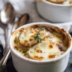 This classic French Onion Soup recipe features deeply caramelized onions simmered in a rich beef stock, enhanced with wine and aromatic herbs. Topped with toasted crusty French bread and melted Gruyere and mozzarella cheese, it delivers a comforting, savory experience perfect for chilly days or anytime you crave a hearty, traditional soup.