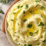 Creamy and flavorful Garlic and Herb Mashed Potatoes made with Yukon Gold potatoes, fresh thyme, sage, garlic, milk, cream, and butter. Perfectly seasoned and infused with aromatic herbs, this comforting side dish is smooth, rich, and topped with fresh parsley and black pepper for a delightful finishing touch.