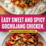 Serve your gochujang chicken over a bed of hot, fluffy rice. I love brown rice, but white rice works great too. Garnish with toasted sesame seeds, the reserved scallion greens, and a few extra basil leaves to make each bowl vibrant and inviting. Trust me, the garnishes add so much freshness and texture right at the end.