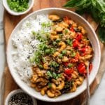 - Stir in the sauce: Reduce the heat to low. Add the roasted cashews and pour in the prepared sauce. Stir occasionally and cook for an additional 2 to 4 minutes to let the sauce thicken and flavors to develop. Remove the skillet from heat and stir in torn basil leaves, or reserve them for garnishing based on preference.