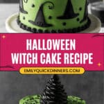 Celebrate Halloween with this spooky and delicious Halloween Witch Cake. Featuring moist layers of chocolate-infused cake frosted with vibrant green and black buttercream, topped with festive witch hats made from melted candy coating and assorted sprinkles, this cake is perfect for a festive party or gathering.
