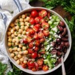 A light, protein-packed Chickpea Tuna Salad combining canned tuna and chickpeas with fresh vegetables, tangy capers, olives, and a creamy Greek yogurt dressing. Perfect for a healthy lunch or quick meal, topped with crumbled feta for added flavor.