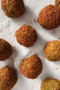 • Leftover falafel can be stored in an airtight container in the refrigerator for up to 2 days and reheated in an oven or air fryer for best texture.