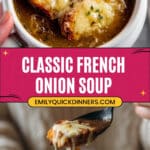 Classic French Onion Soup featuring slowly caramelized onions simmered in a rich beef and chicken broth, topped with toasted baguette slices and melted Gruyere cheese. This comforting and flavorful soup is perfect for cozy meals and showcases the perfect balance of sweet, savory, and cheesy goodness.