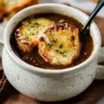 Classic French Onion Soup featuring slowly caramelized onions simmered in a rich beef and chicken broth, topped with toasted baguette slices and melted Gruyere cheese. This comforting and flavorful soup is perfect for cozy meals and showcases the perfect balance of sweet, savory, and cheesy goodness.