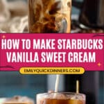 5. Prepare Vanilla Sweet Cream: In a small bowl, mix 1/2 cup 2% milk, 1/2 cup heavy cream, and 2 tablespoons of the prepared vanilla syrup. Stir well until combined. Store unused cream in an airtight container in the refrigerator; it lasts 3 to 4 days.