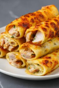 Place a generous spoonful of your chicken bacon ranch filling along one edge of each mozzarella slice. Then carefully roll them up, starting at the filling side, tucking in the seam underneath so they stay closed while baking. This part is fun—you’ll get a feel for when they’re just the right size and wrapped tight enough.