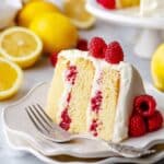 - Assemble the cake: Once the cakes are cooled, remove them from the pans. Place one layer on your serving plate and spread a generous amount of frosting on top. Add the next cake layer and cover the entire cake with frosting. Garnish with fresh raspberries and lemon slices on top for a beautiful presentation.